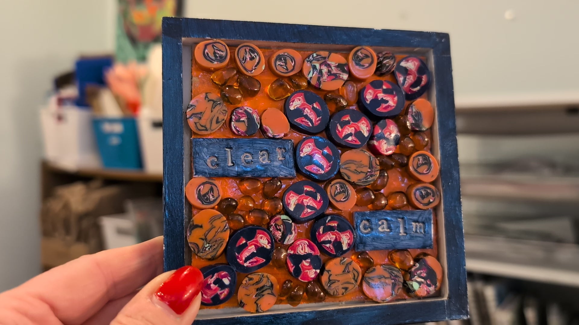 Clear & Calm Mosaic is made from handmade polymer clay pieces, textured and painted, and then mounted in a wooden frame.