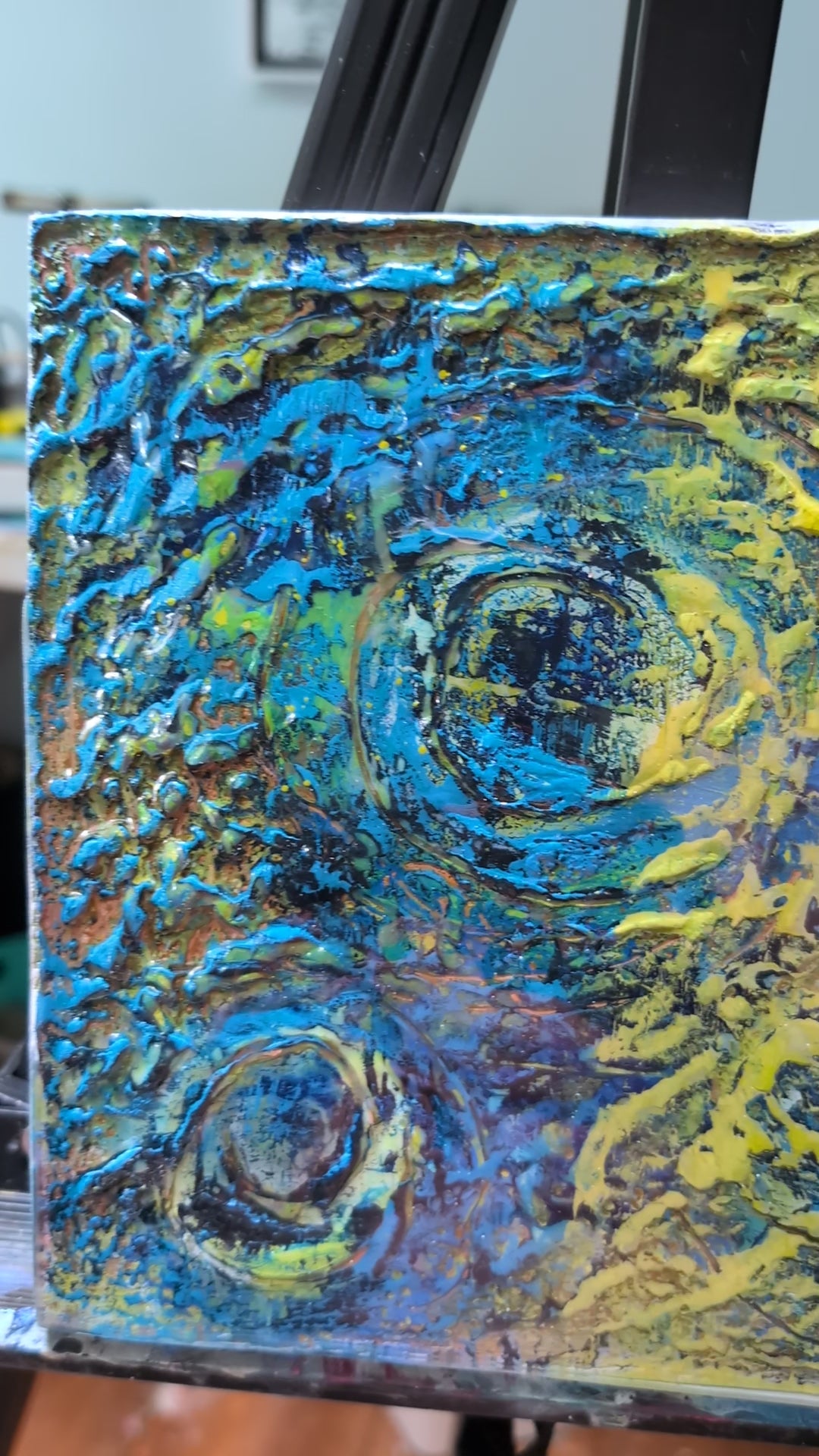 Swirling textures in encaustic and resin capture the mysterious turbulence of distant worlds, evoking planetary motion, energy, and cosmic depth