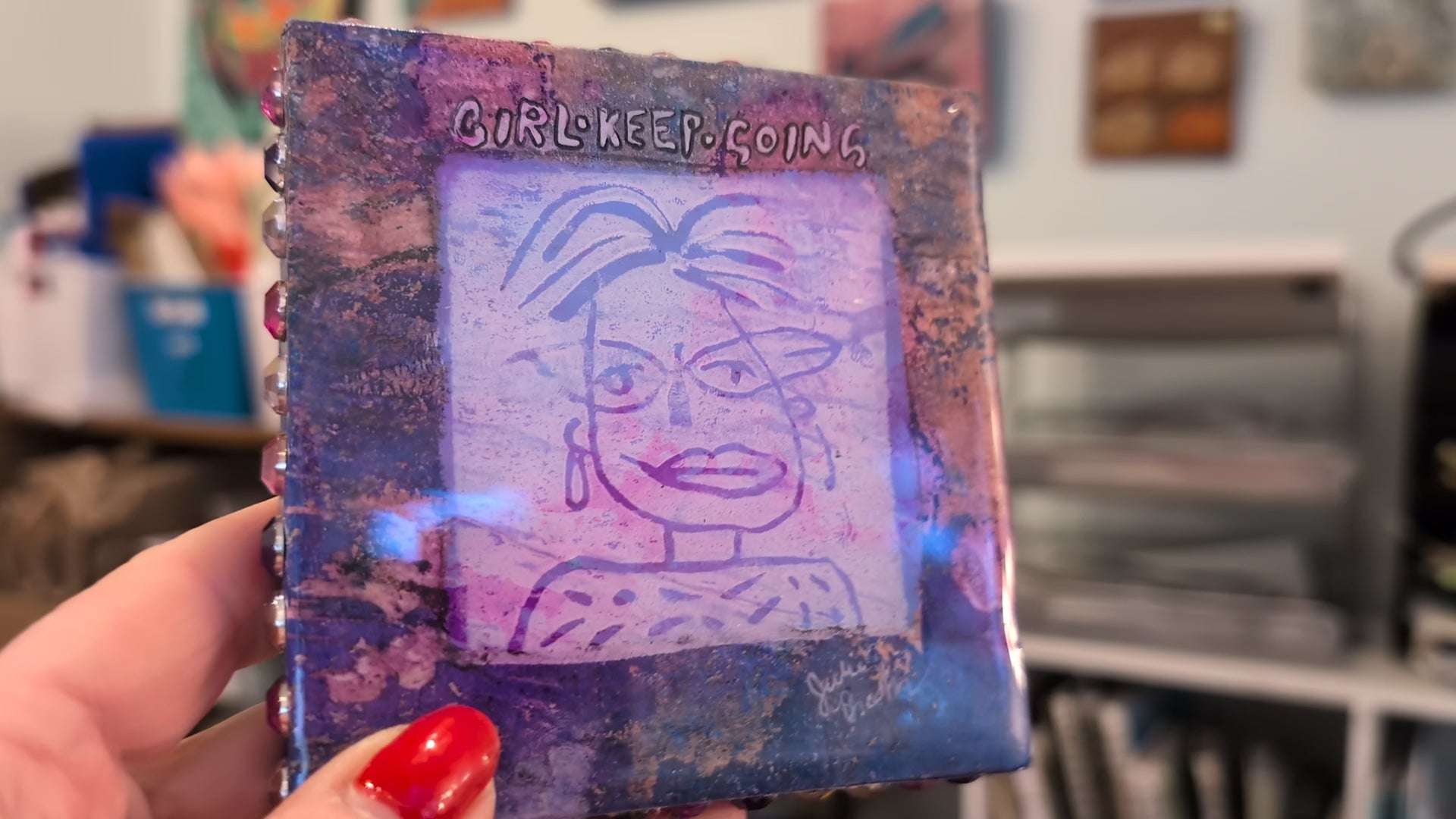 Girl Keep Going #4 is an original linocut printed on a gel monoprint wrapped around an upcycled MDF panel and resined and bedazzled for an elevated look.