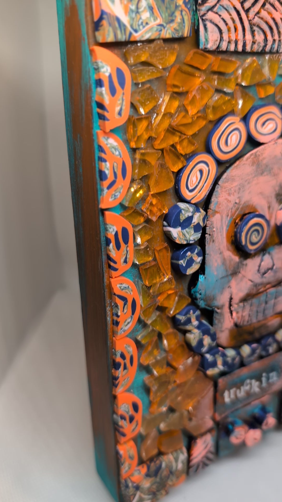 Alive with color and Day of the Dead energy, this piece riffs on the Grateful Dead’s “Truckin’.” Spiraling eyes, grinning skull, and rhythmic tesserae capture the song’s restless motion and iconic refrain: “What a long, strange trip it’s been.”