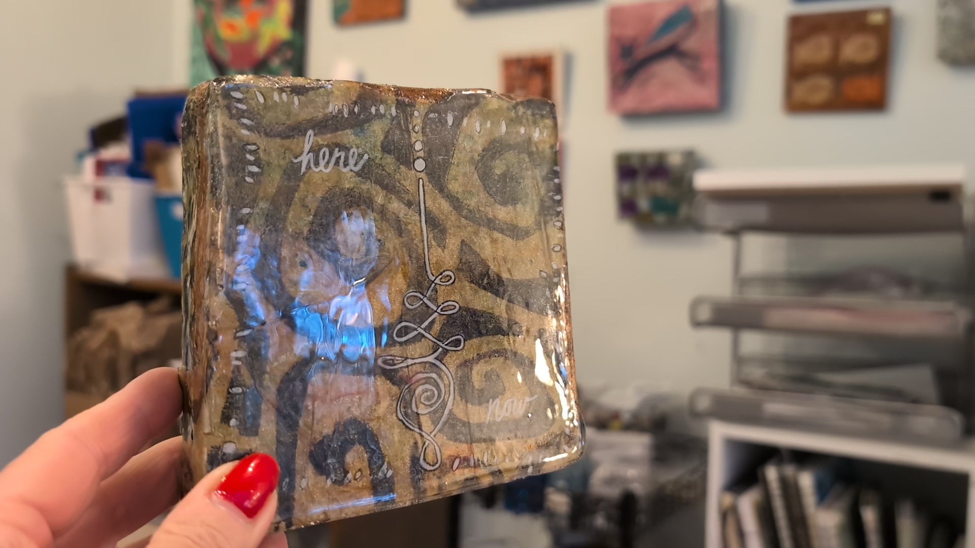 Shanti: Meditation Icon is a gel monoprint wrapped around a gallery-depth upcycled foam block and resined for an elevated look. Can rest on a shelf/table or hang on a wall.