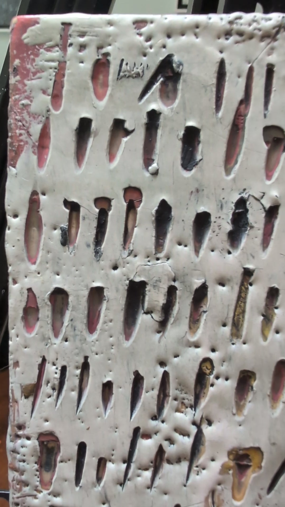 Layers of encaustic wax are carved and etched to reveal hidden colors and textures, creating a calming, tactile rhythm of pattern and variation.