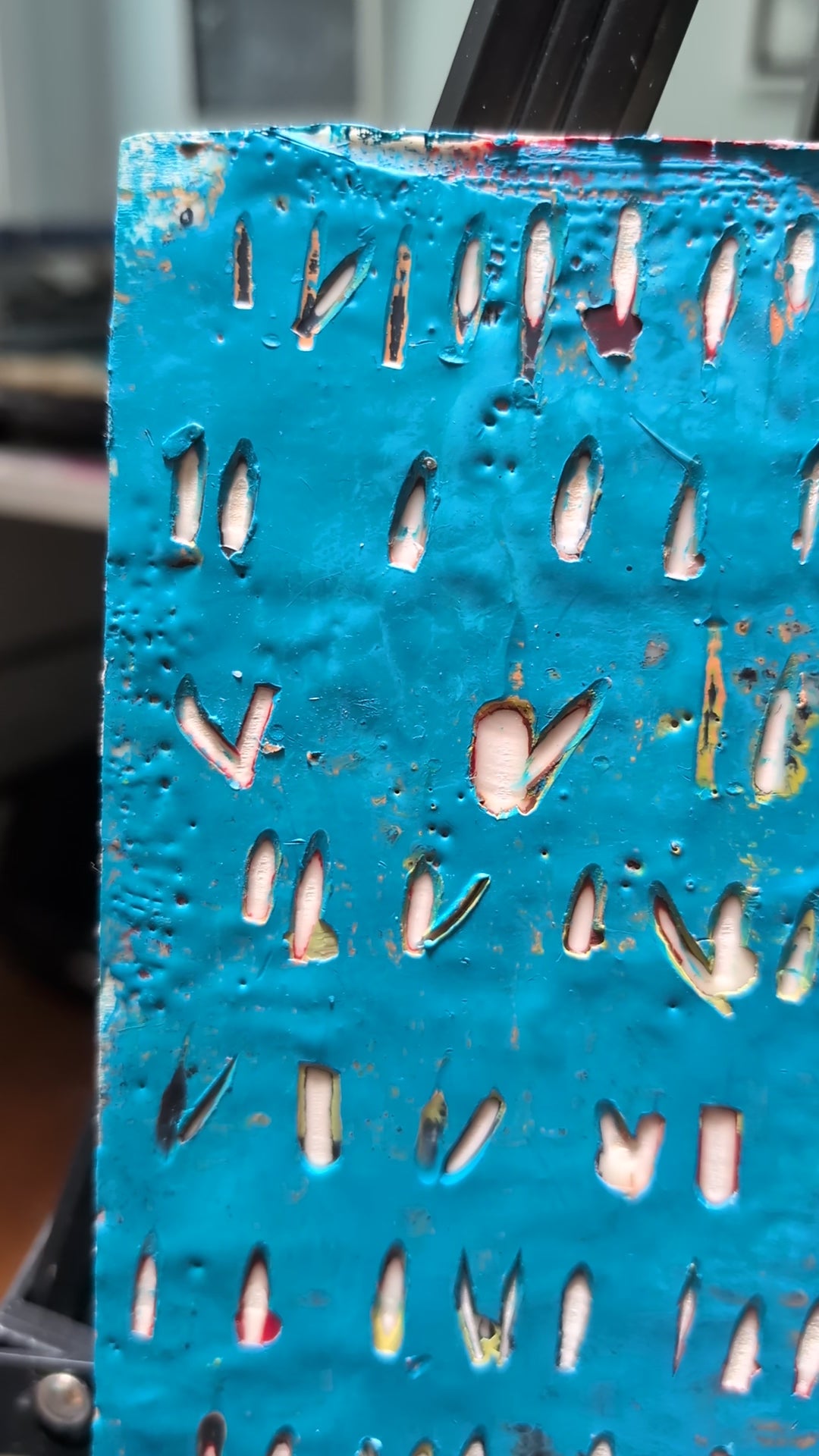 Layers of encaustic wax are carved and etched to reveal hidden colors and textures, creating a calming, tactile rhythm of pattern and variation.