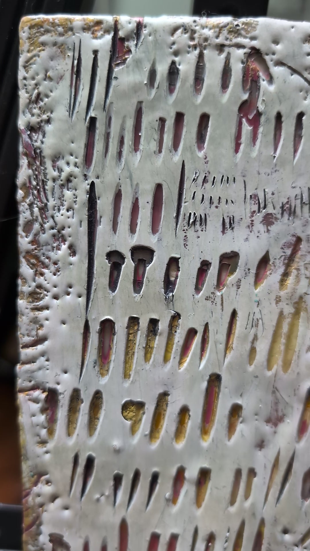 Layers of encaustic wax are carved and etched to reveal hidden colors and textures, creating a calming, tactile rhythm of pattern and variation.