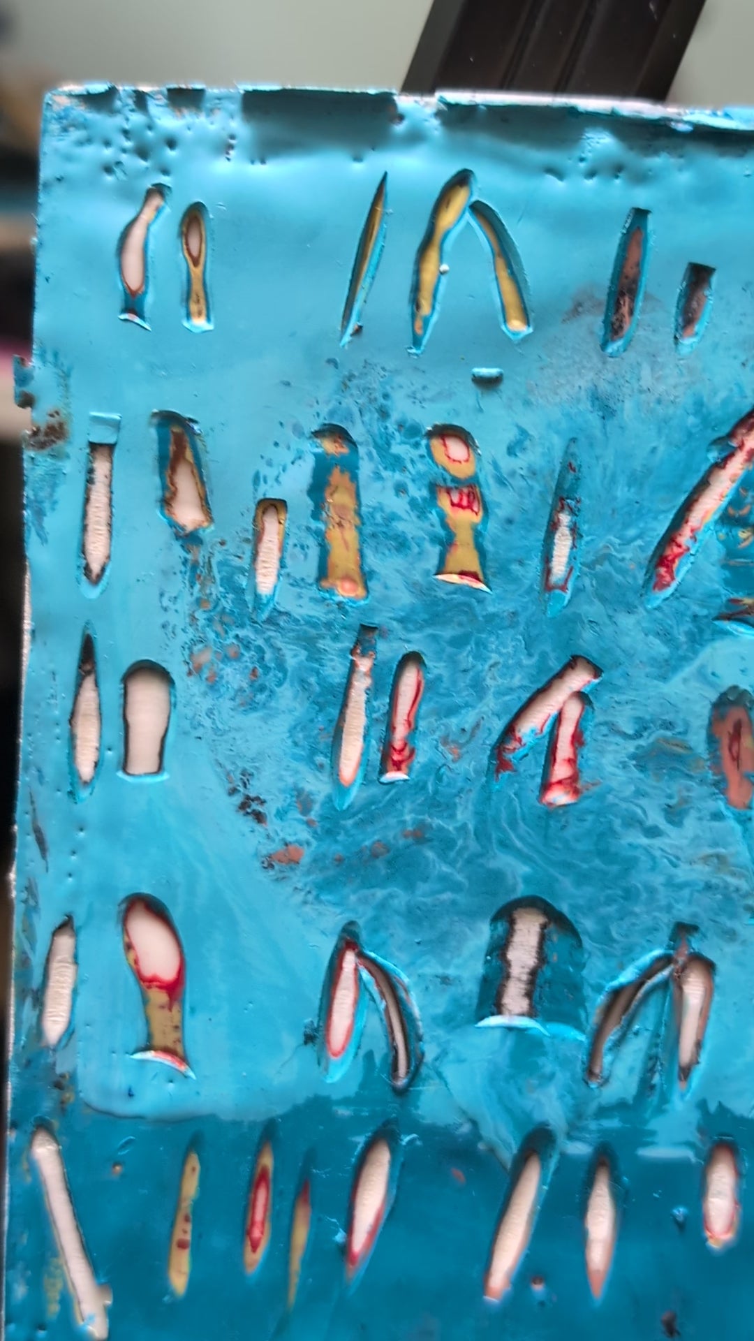 Layers of encaustic wax are carved and etched to reveal hidden colors and textures, creating a calming, tactile rhythm of pattern and variation.