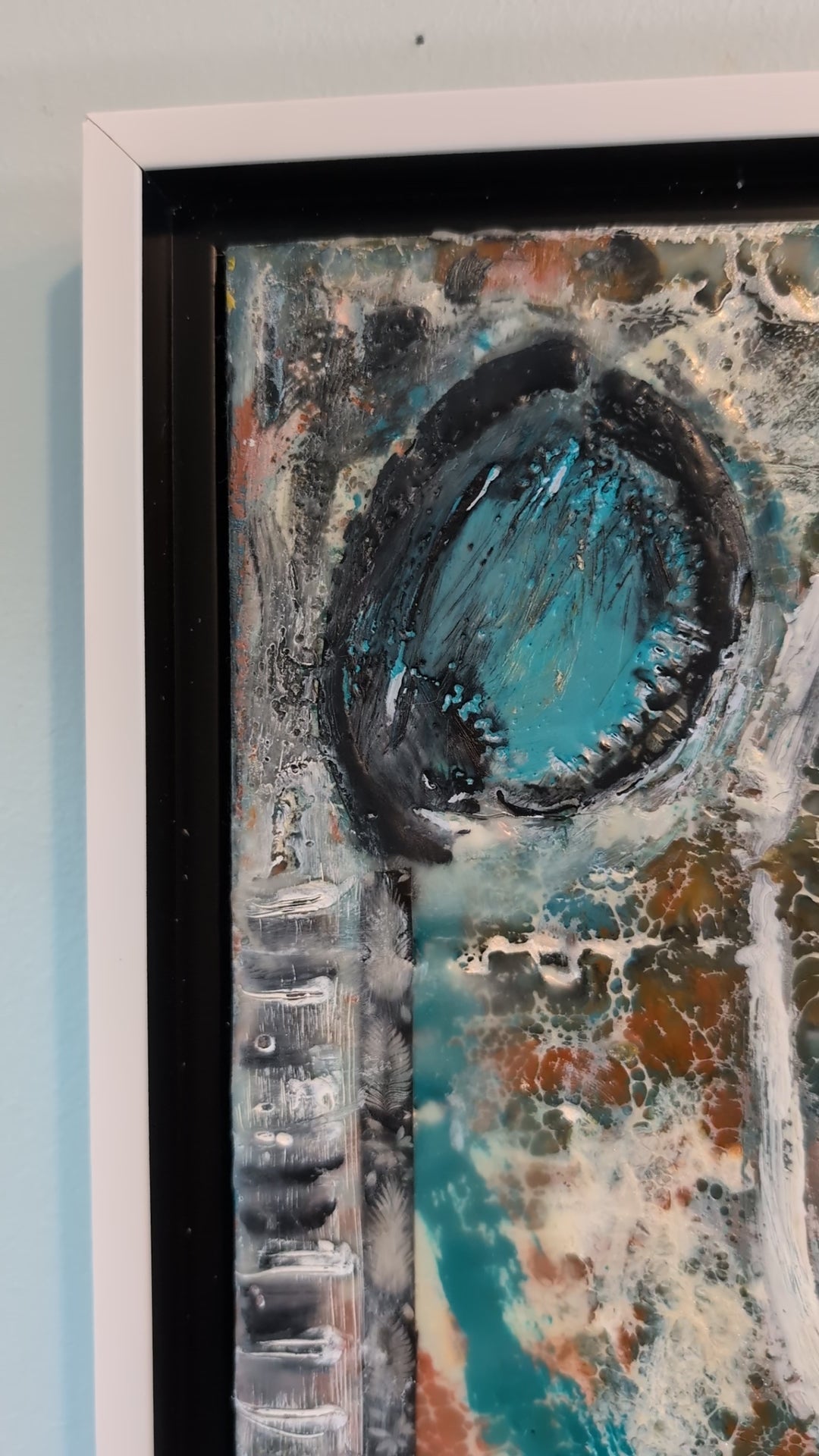 Encaustic mixed media (encaustic wax, tar, oil paint) on upcycled MDF board