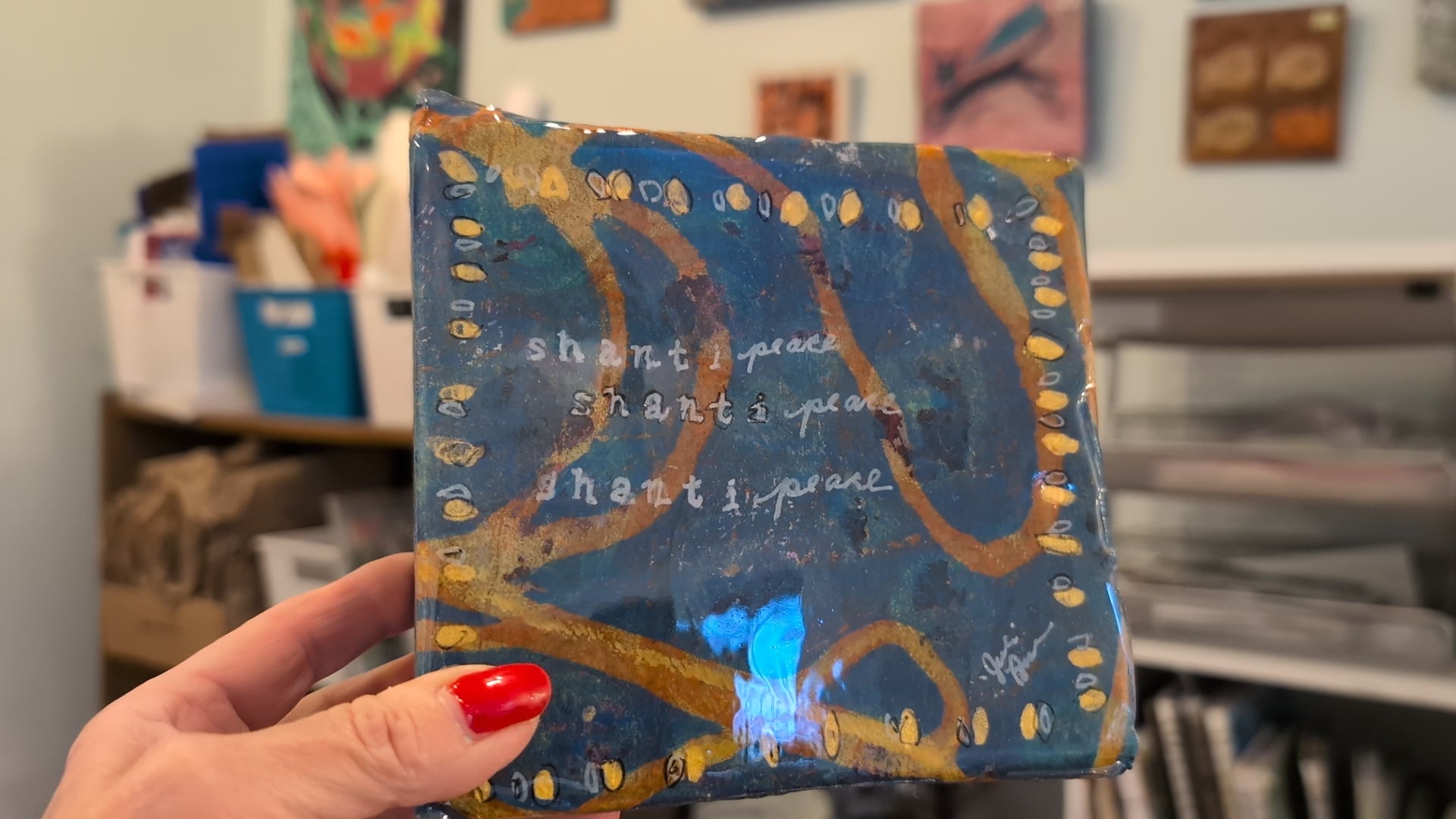 Shanti: Meditation Icon is a gel monoprint  wrapped around a gallery-depth upcycled foam block and resined for an elevated look.   Can rest on a shelf/table or hang on a wall.