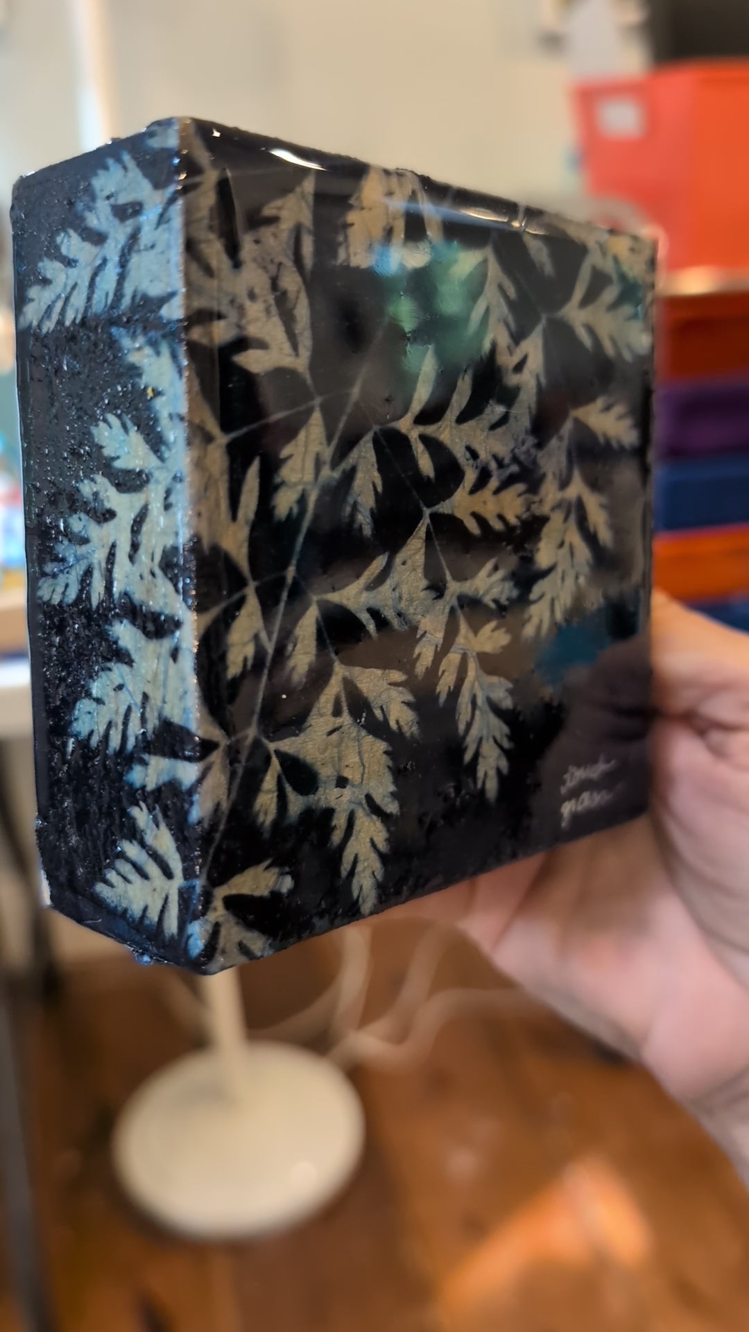 A 4x4-inch cyanotype print capturing the delicate silhouette of fern-like foliage in deep indigo and soft cream. The piece is wrapped around a wood block and sealed in glossy resin, giving it a luminous finish and tactile presence. Designed to rest on a table, hang on a wall, or fit comfortably in the palm of your hand, Touch Grass offers a quiet invitation to reconnect with the natural world—beautiful in its simplicity, and grounded in stillness.