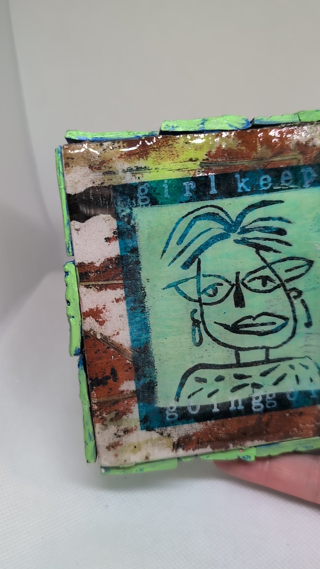 Earthy tones and vivid greens frame a determined linocut portrait. Textured gel prints and resin finish turn the phrase into both encouragement and affirmation: girl, keep going.
