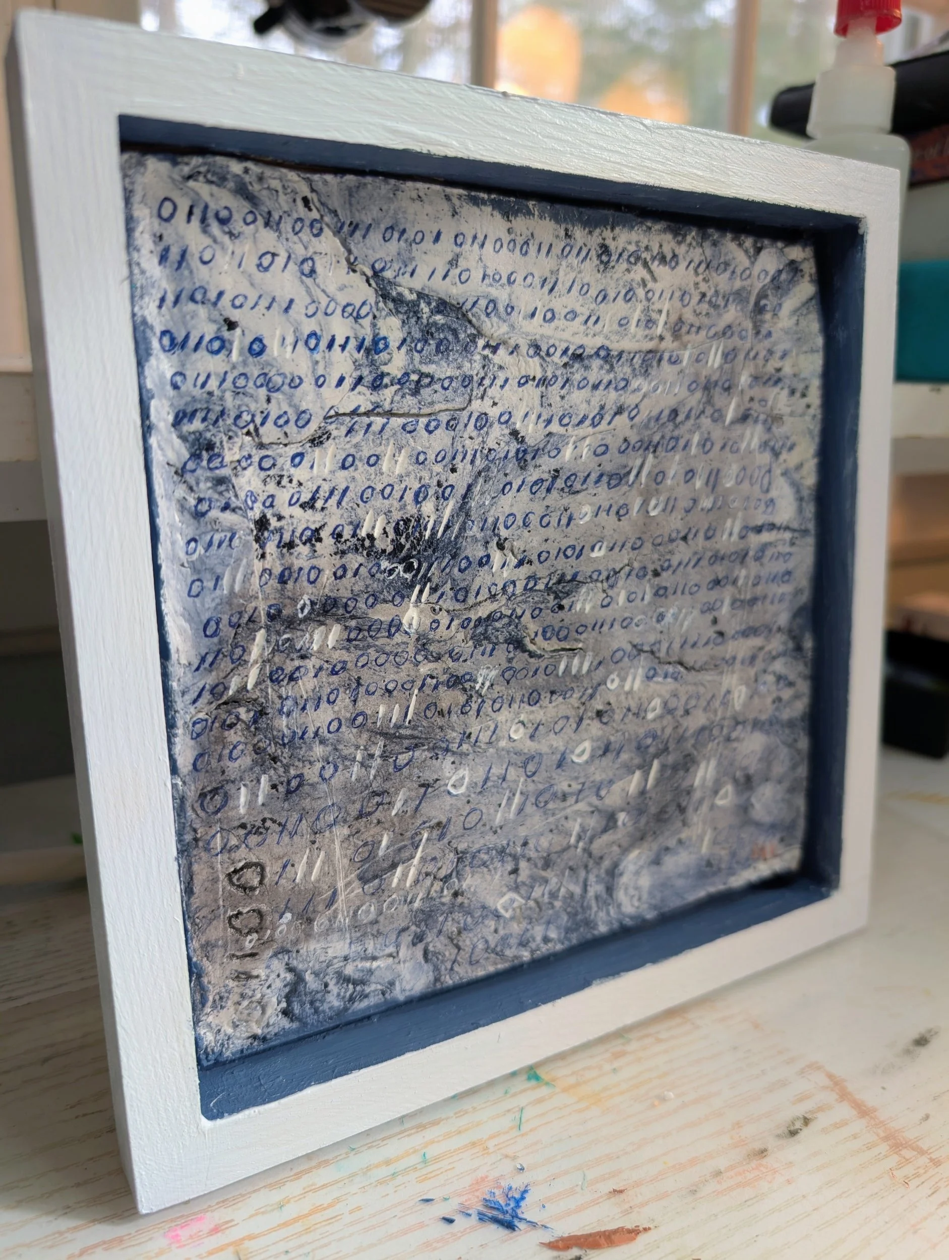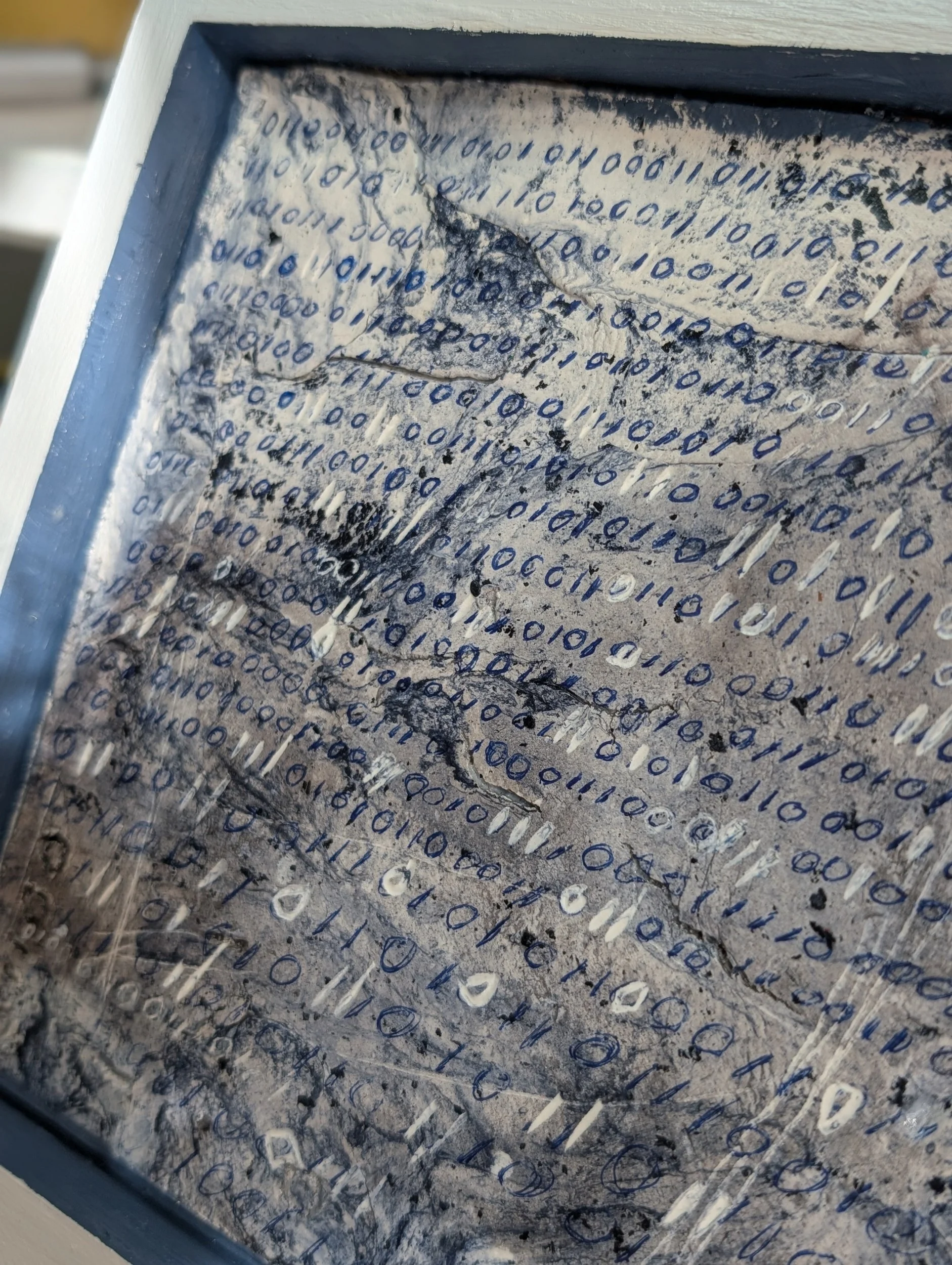 After it dried, I went in with gel pens and started making marks. At first it just looks abstract, but it actually has words of political resistance written in binary code. Kind of hidden in plain sight.
